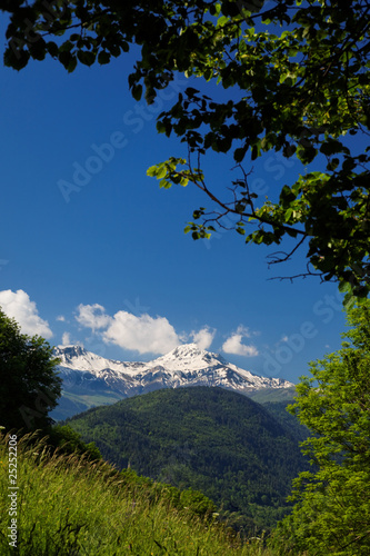 Panoramic view of lush green alpine landscape under a cloudy sky