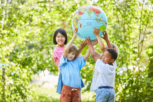 Gruppe Kinder hält Globus oder Weltkugel hoch
