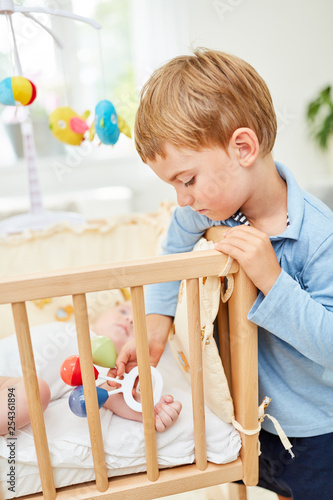 Junge als fürsorglicher Bruder am Babybett