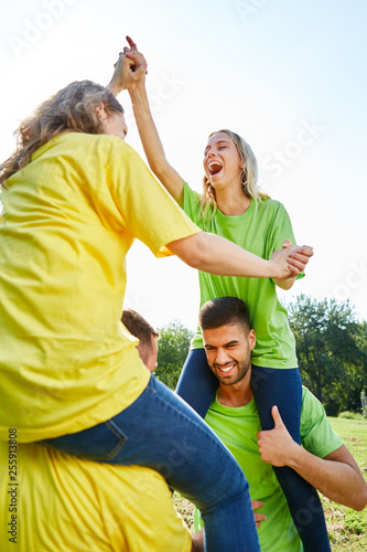 Sieger Mannschaft mit Pokal jubelt bei Teambuilding Event