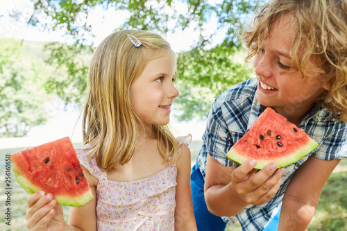Mädchen gibt ihrem Bruder ein Stück Melone