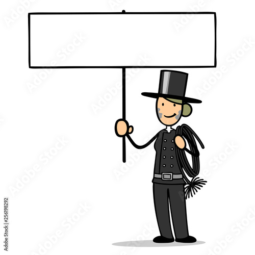 Schornsteinfeger als Frau hält leeres Schild hoch