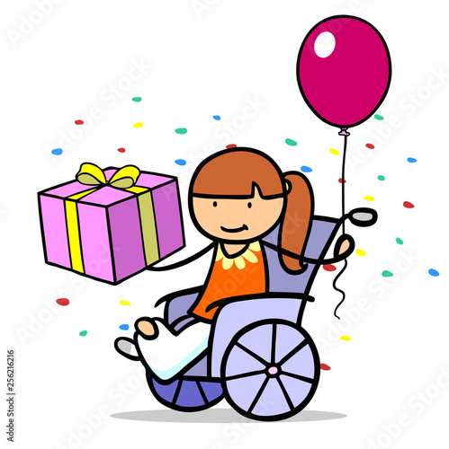 Mädchen im Rollstuhl mit Gipsbein und Geschenk