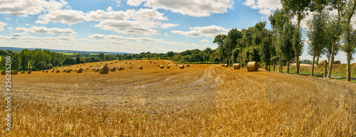 Wide panoramic view of a rural hayfield with trees and cloudy skies