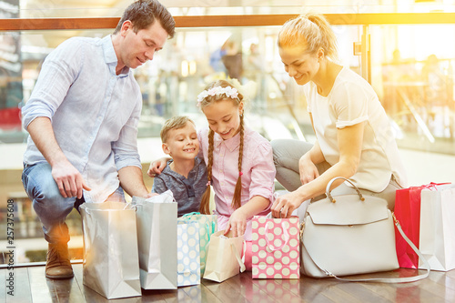 Familie mit Einkaufswagen in einem Fahrstuhl