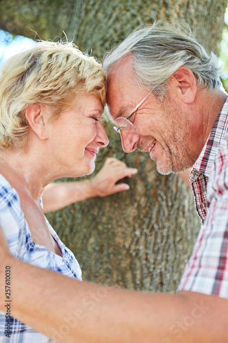 Verliebtes Paar Senioren steht Stirn an Stirn