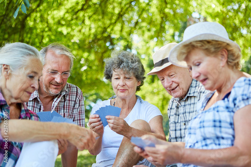 Senioren Freunde beim Karten spielen im Park