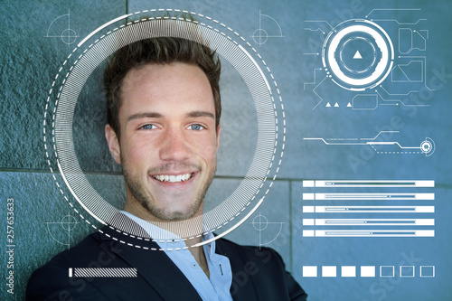 Geschäftsmann mit futuristischer Datenschnittstelle auf abstraktem, modernem Hintergrund