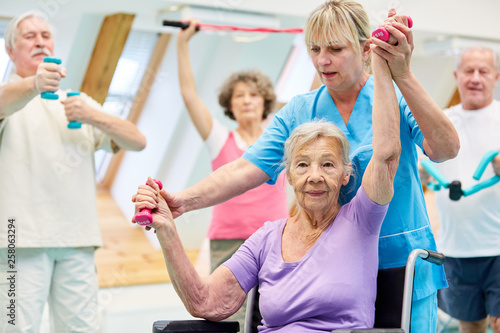 Alte Frau trainiert mit Hanteln im Reha Kurs