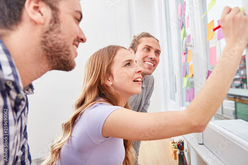 Junges Paar beim Tapezieren mit Tapete an Wand