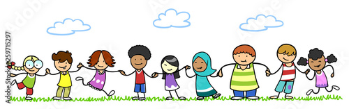 Gruppe Cartoon Kinder hängt an Leine als Trennlinie