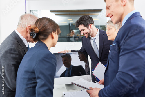 Gruppe Geschäftsleute schaut auf neuen Computer