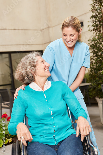 Pflegehilfe und Senior vor Tafel mit Muskel Armen als Pflege Konzept