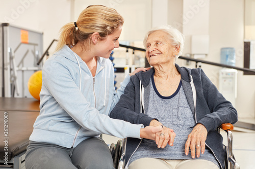 Trainerin betreut eine Senior Frau im Rollstuhl