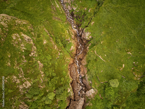 Creek with waterfall in the mountains from above