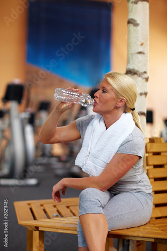 Frau im Fitnesscenter trinkt Wasser