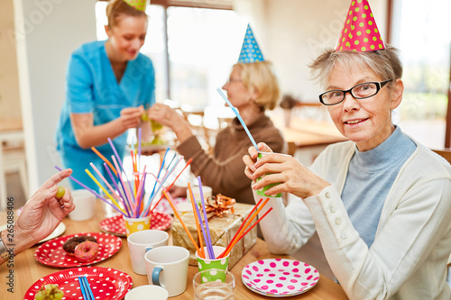 Senior woman in nursing home celebrating carnival