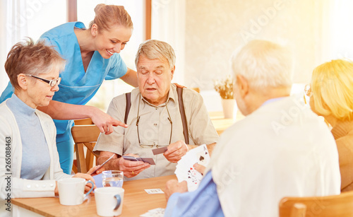 Senioren spielen Karten in der Freizeit im Altersheim