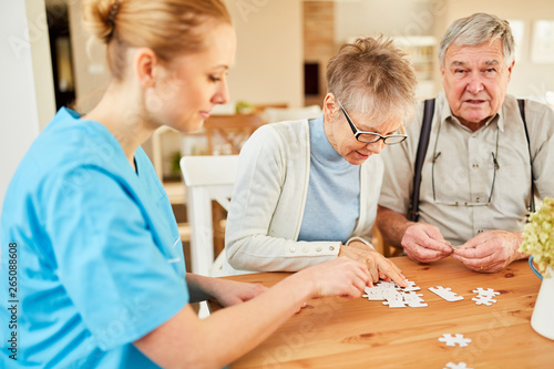 Altenpflegerin hilft Senioren beim Puzzle spielen