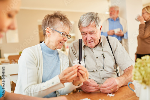 Pflegekraft und Senioren Paar beim Puzzle spielen