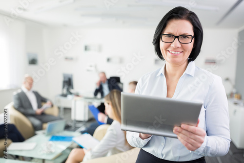Geschäftsfrau mit Brille bedient Tablet Computer
