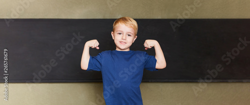 Schüler zeigt Muskeln vor Tafel in Grundschule