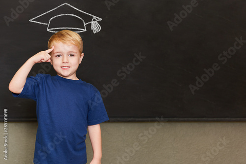 Schüler in Schule vor Tafel mit Doktorhut