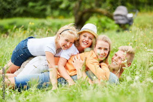Familie und Kinder kuscheln zusammen im Gras