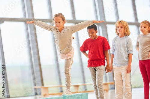 Mädchen in Schule steht vor Tafel mit Muskeln