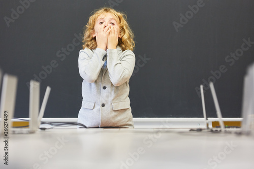 Mädchen in Schule steht vor Tafel mit Muskeln