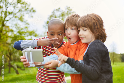 Drei Kinder albern herum und machen ein Selfie