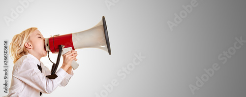 Kind ruft in Megafon als Empfehlung Konzept