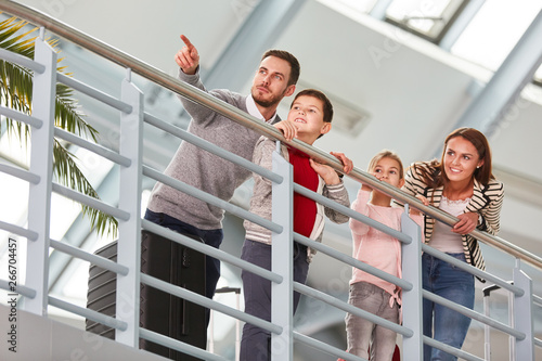 Familie mit zwei Kindern im Flughafen Terminal hat Spaß