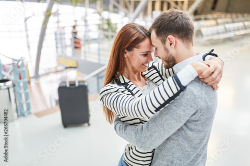 Paar in Fernbeziehung bei Umarmung am Flughafen