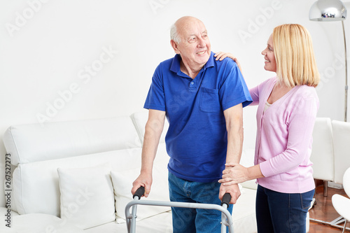 Senior mit Gehhilfe macht Reha mit Therapeutin