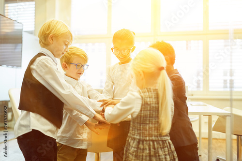 Gruppe Kinder stehen im Kreis und stapeln Hände