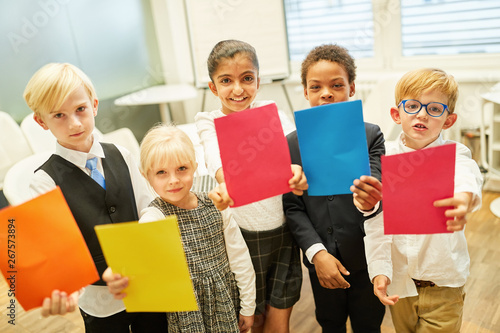 Kinder als Geschäftsleute mit bunten Zetteln