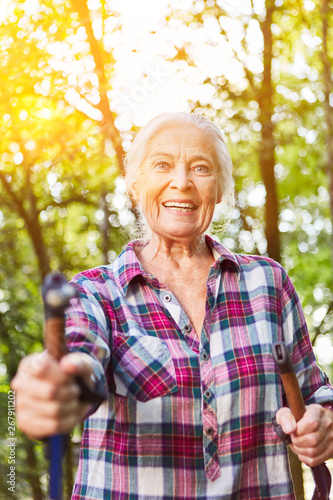Seniorin bei Nordic Walking oder Wanderung