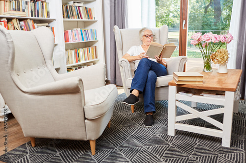 Seniorin sitzt im Sessel und liest ein Buch