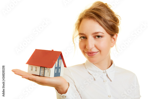Frau trägt Einfamilienhaus auf ihrer Hand