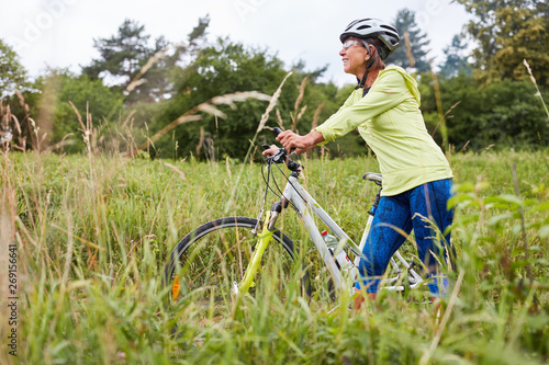 Aktive Senior Frau mit dem Fahrrad unterwegs