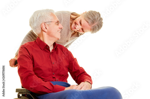 Alte Frau umarmt Senior Mann im Rollstuhl