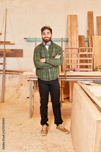 Schreiner trägt Bretter im Holzlager der Tischlerei