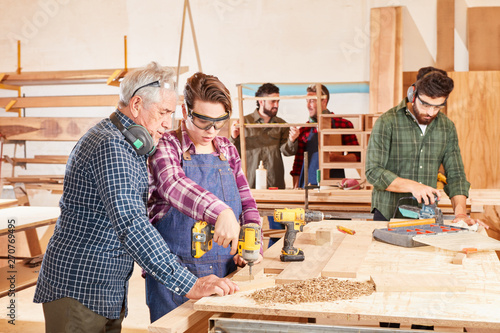 Ausbilder lehrt Schreiner Lehrlinge in der Tischlerei