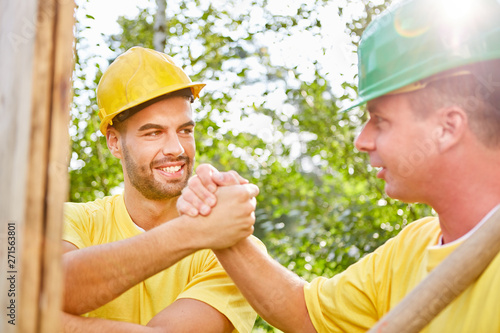 Zwei Bauarbeiter gratulieren sich beim Bau