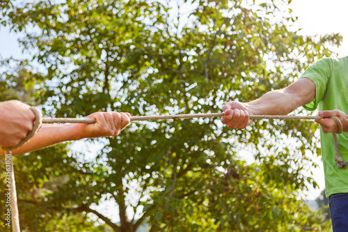 Junge Leute beim tauziehen trainieren ihre Kraft