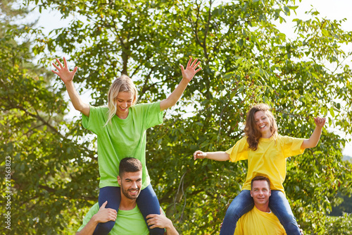 Friends have fun piggybacking