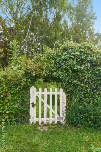 Enchanting secret garden with sunlight behind an old mansion's overgrown foliage