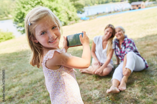 Kleines Mädchen fotografiert Oma und Mutter
