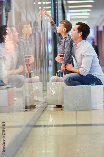 Familie mit Einkaufswagen in einem Fahrstuhl